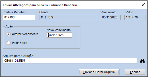 Para enviar a alteração do vencimento, entrar na opção dentro do módulo Financeiro - Ferramentas - Contas a Receber - Cobrança Bancária - Alteração