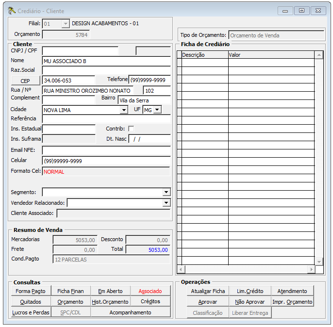 Tela do Crediário com o nome do Associado.