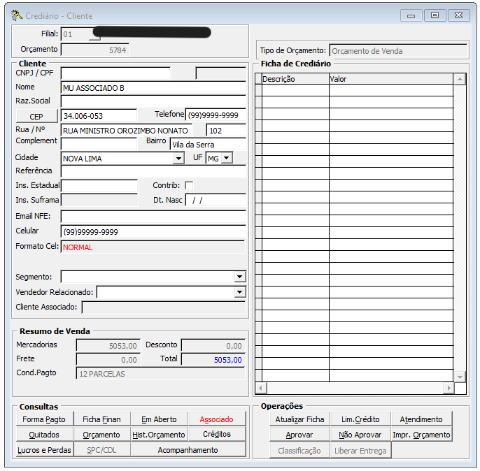 Tela do Crediário com nome do Associado