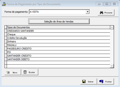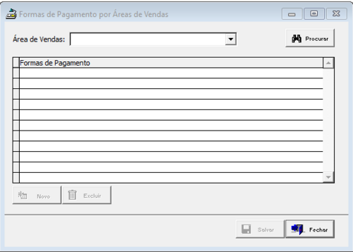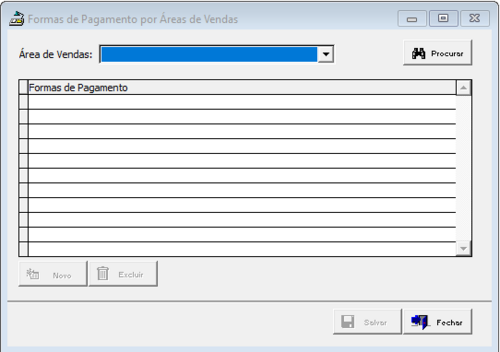 Nesta opção você seleciona a área de vendas e informa quais Formas de Pagamentos são permitidas.