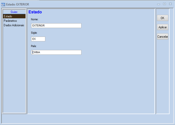 Cadastrar um estado chamado Exterior, com a sigla EX e relacionar o País, na opção Cadastros - Núcleo Comum - Estados: